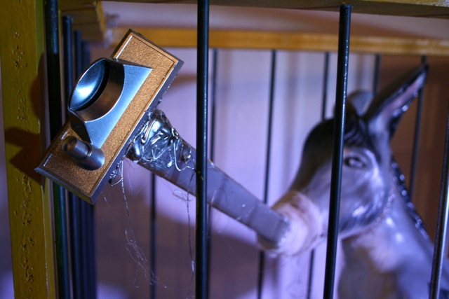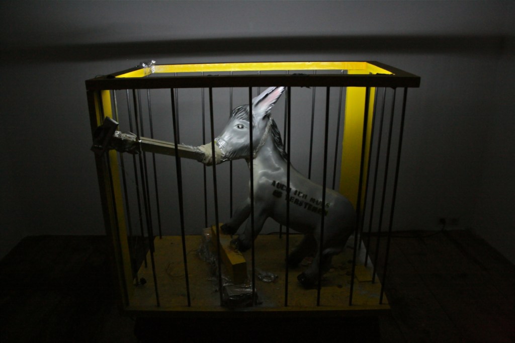 Auf der Seite trägt der Anhäufungsapparat den Schriftzug “Auch ich musses verstehen”, ein Zitat von Berthold Brecht, das hier auf eine zweite Ebene der Ausweglosigkeit hinweist: Trotz oder gerade weil der Esel sich in einem ausbeuterischen Verhältnis befindet, bleibt ihm als erster Schritt in Richtung Ausweg nur die Reflexion der (gesellschaftlichen) Verhältnisse und seiner Arbeitsbedingungen. („Auf einen Längsbalken, der die Decke von Brechts Arbeitszimmer stützt, sind die Worte gemalt: ,Die Wahrheit ist konkret.’ Auf einem Fensterbord steht ein kleiner Holzesel, der mit dem Kopf nicken kann. Brecht hat ihm ein Schildchen umgehängt und darauf geschrieben: ,Auch ich muss es verstehen.’“ (Walter Benjamin, Aufzeich-nungen 1933-1939. In: Gesammelte Schriften. Frankfurt am Main, BandVI, 1985)